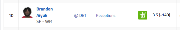 Still, I can’t help but think Aiyuk will top five catches on Sunday while going over 46.5 receiving yards against a suspect Lions secondary. I would double down on both plays to hedge that bet. The call is yours, I’m rolling with both.