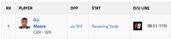 Panthers WR D.J. Moore over 58.5 receiving yards (-115)