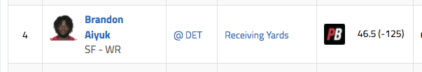 49ers WR Brandon Aiyuk over 46.5 receiving yards (-125)