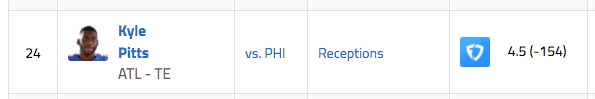 Falcons TE Kyle Pitts over 4.5 catches (-154)
