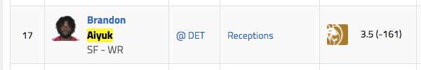 49ers WR Brandon Aiyuk over 3.5 catches (-161)