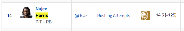 Steelers RB Najee Harris over 14.5 carries (-125)