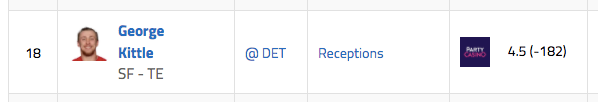 49ers TE George Kittle over 4.5 catches (-182)