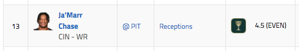 WR Ja’Marr Chase over 4.5 catches (EVEN)